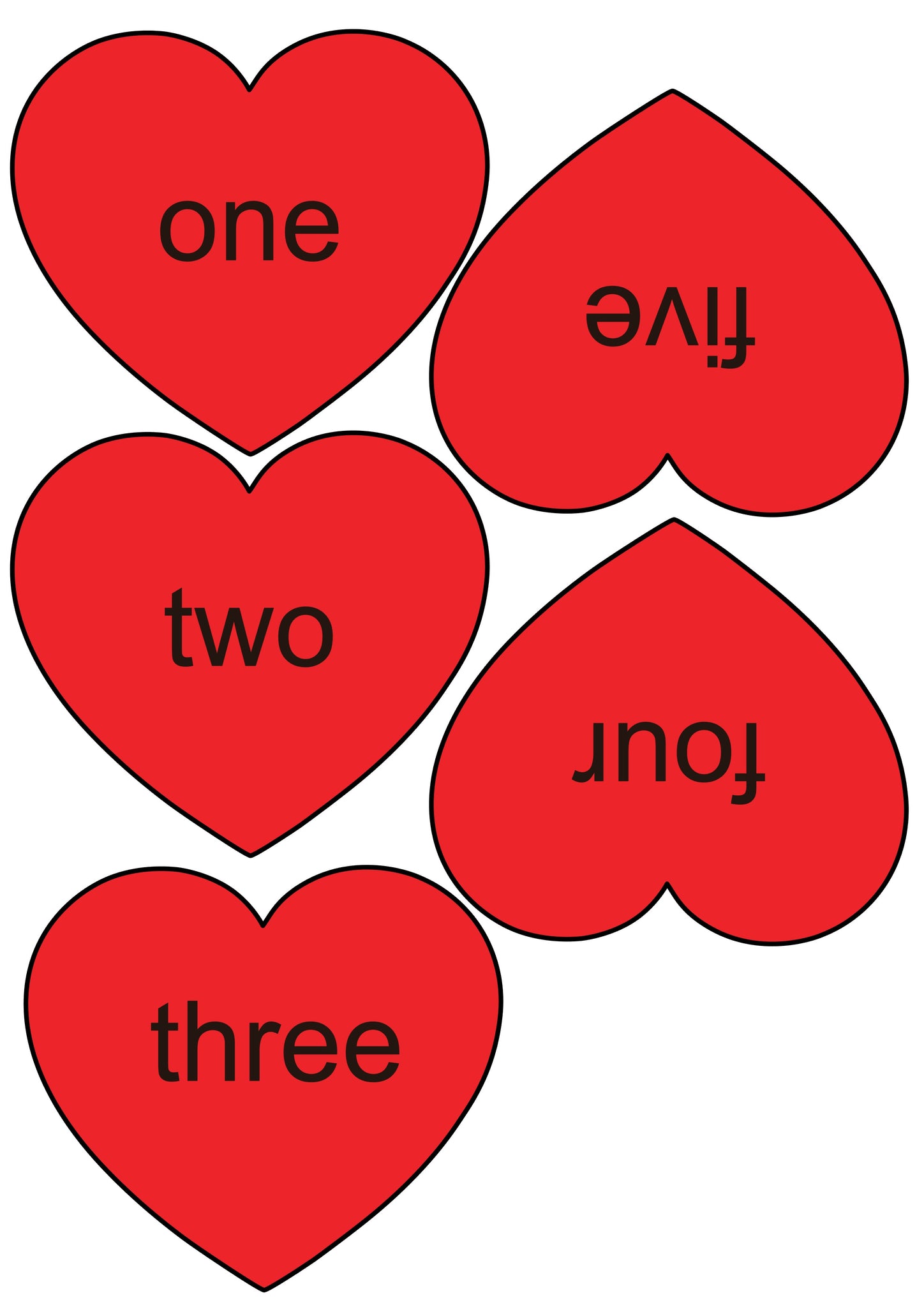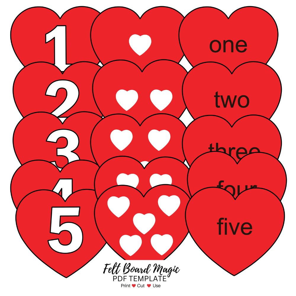 The purpose of this set is to match up the hearts with numbers with correct heart containing same quantity of little hearts. A further challenge would be to match up the heart with the correct number word.